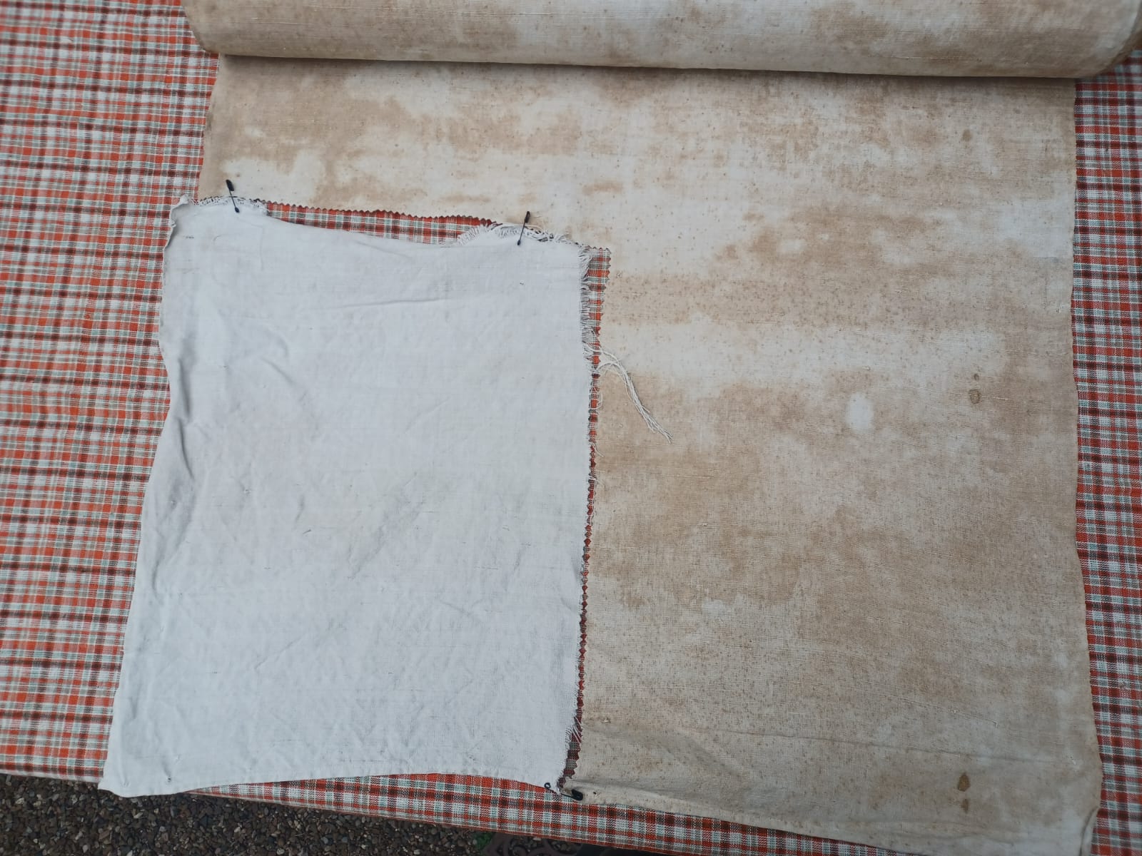 Auf den letzten Bildern kann man erkennen, dass sich Gilb- und Liegeflecken vollständig beseitigen lassen. Dazu wird das Leinen wie schon zu Großmutters Zeiten einfach nur in der Sonne gebleicht.
